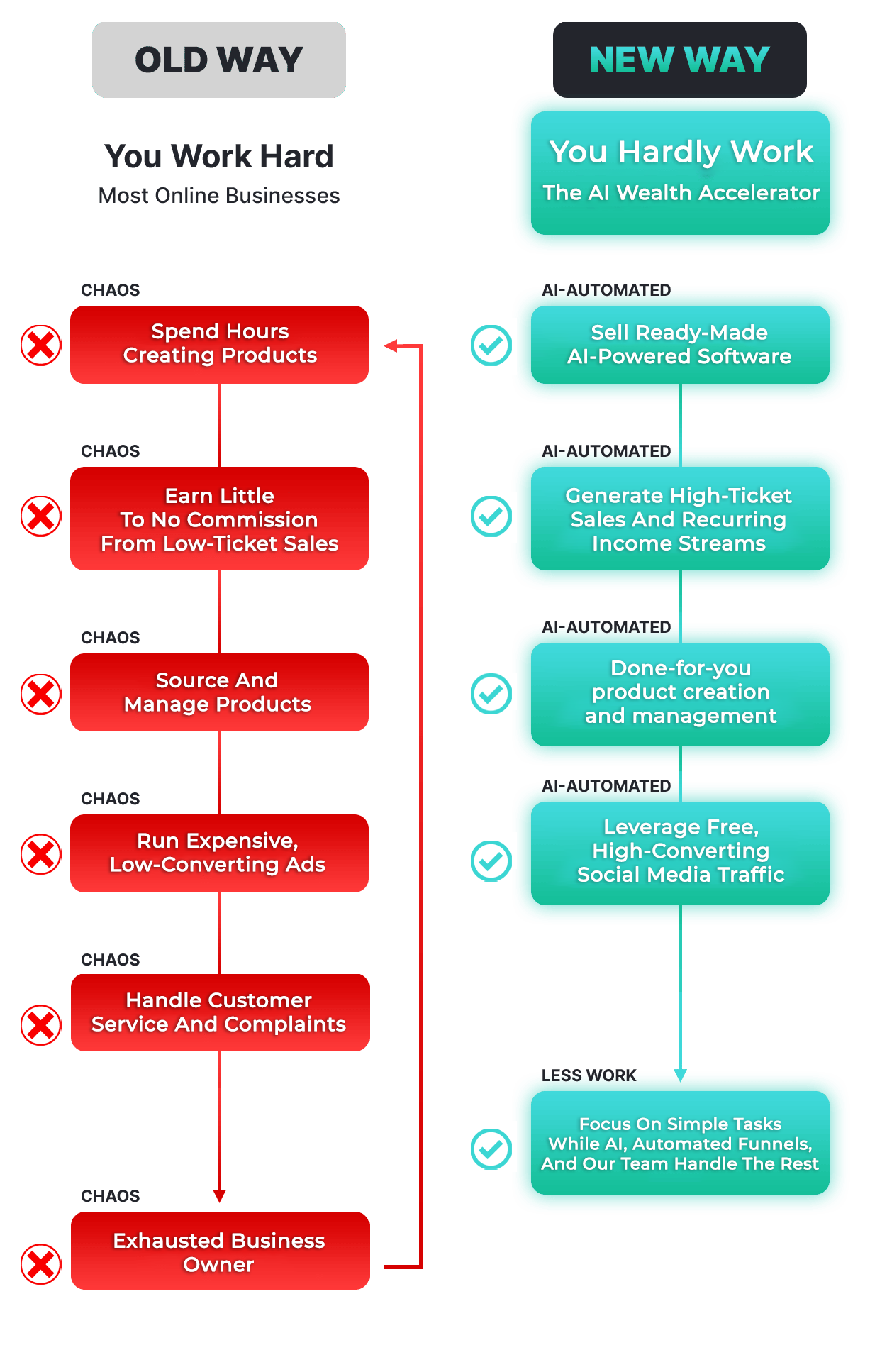 Here’s how I went from being overworked and frustrated with traditional business models to achieving financial freedom through the AI Wealth Accelerator by ignoring common wisdom, breaking all the rules, and turning the traditional online business model upside down.